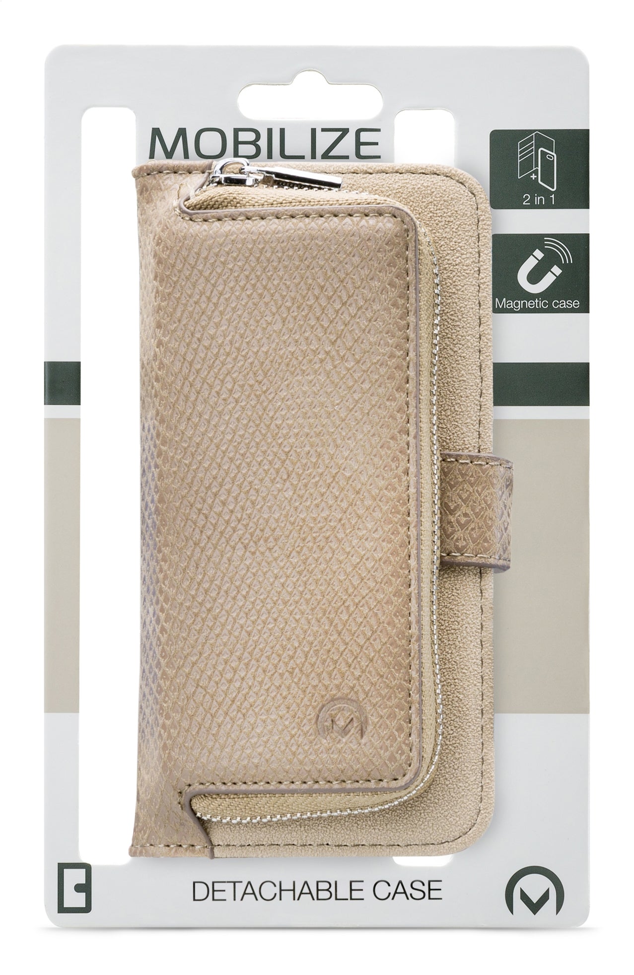 Met de luxueuze Mobilize 2in1 Gelly Wallet Zipper Case heeft u altijd al uw spullen bij elkaar voor een dagje winkelen of een avond uit.  Binnenin de case zitten drie vakjes voor uw ID kaart, bankpas of klantenkaarten. Eén van die vakjes heeft een handige slide functie om uw meest gebruikte pas nog makkelijker uit het vakje te krijgen. Er zit ook een groter vak voor papiergeld of andere papieren in. De voorkant van de modieuze Gelly Wallet Zipper Case is een mooi afgewerkte portemonnee met rits. Perfect voor uw sleutels en voor spullen die u én snel bij de hand én veilig opgeborgen wil hebben. Het elegante polsbandje, het subtiele lizard motiefje en de zilverkleurige sluitingen maken van deze case een echt fashion item.