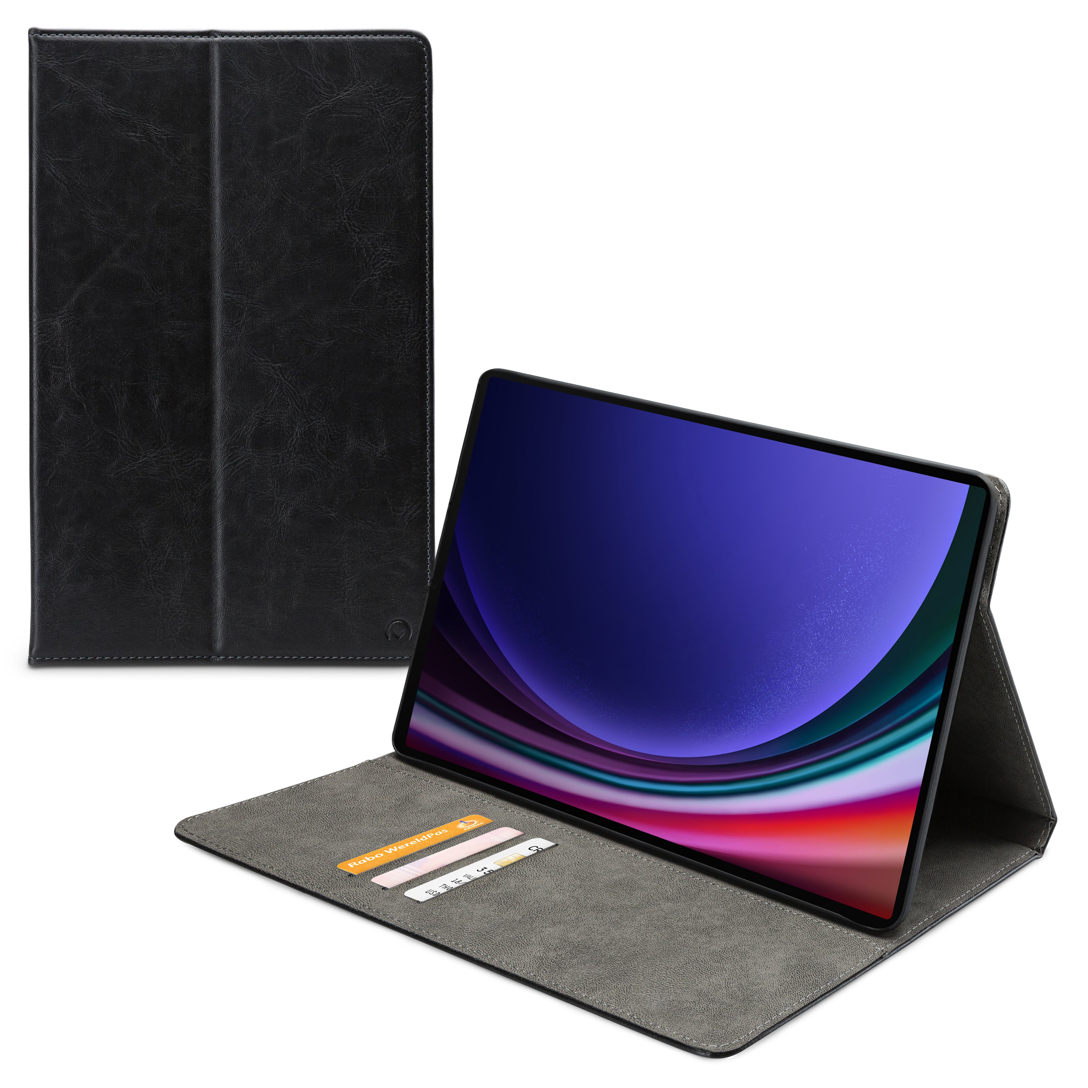 Aan de linker binnenkant van de case zitten drie vakjes voor pasjes, briefgeld en/of visitekaartjes. De case beschikt over een stand functie, zodat je hem makkelijk neer kunt zetten om bijvoorbeeld Netflix of foto’s te kijken. Ook heeft hij aan de linker binnenkant een band waar je hand doorheen kan steken zodat je jouw tablet goed vast kan houden.