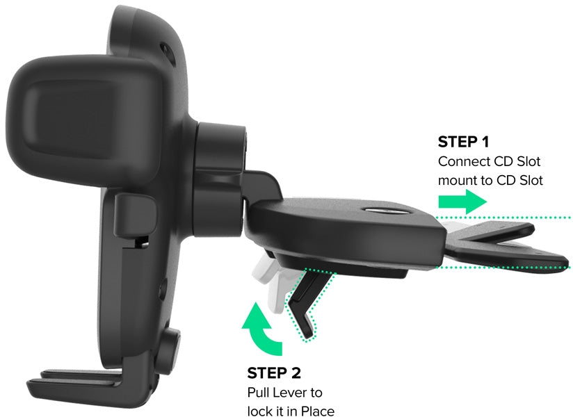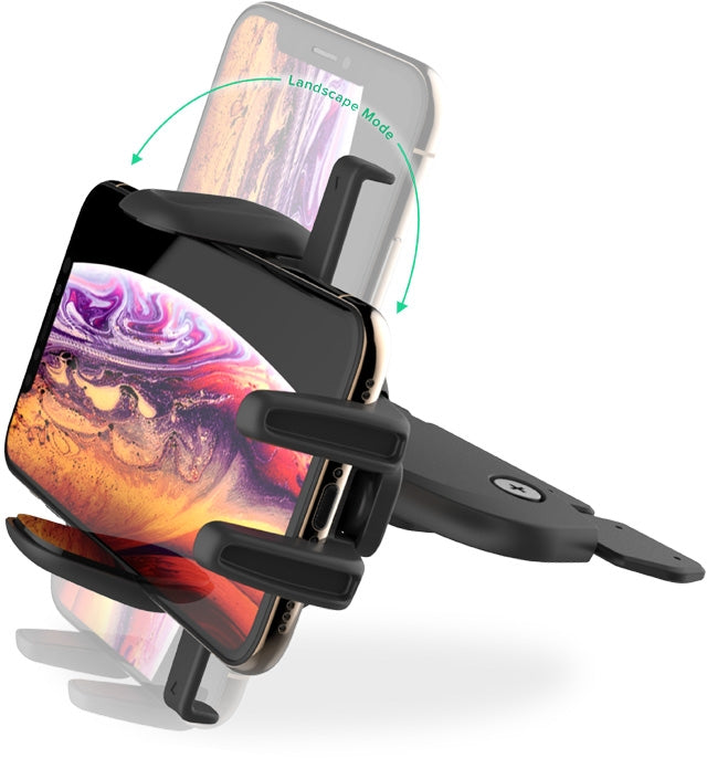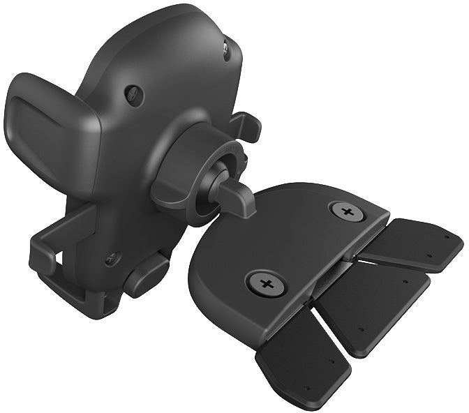 Het kogelgewricht maakt het mogelijk om de houder in bijna elke hoek te draaien. Met een druk op 2 knoppen aan de zijkanten van de houder laten de armen het toestel los zodat je het toestel makkelijk uit de houder kunt nemen. Deze houder kan je in de cd-lade van jouw autoradio bevestigen.