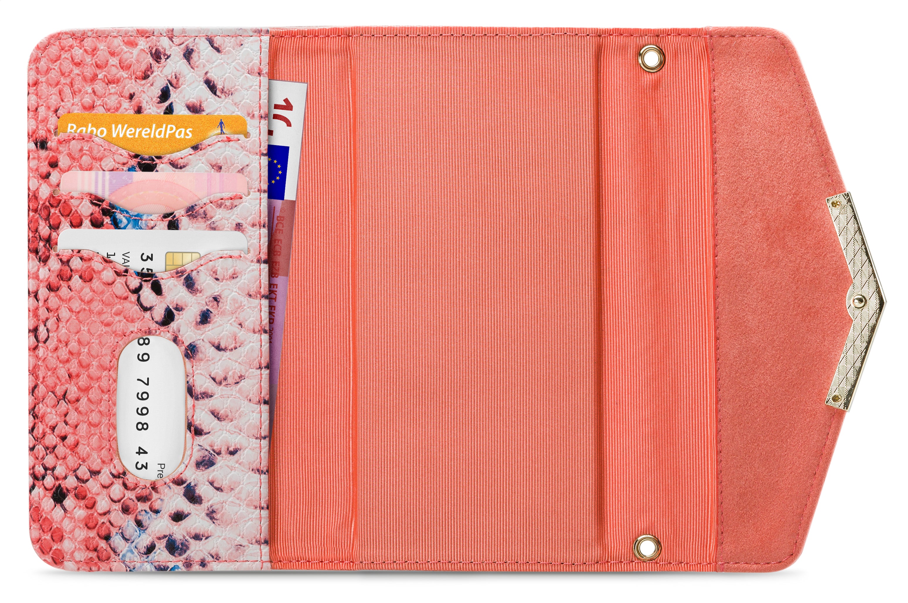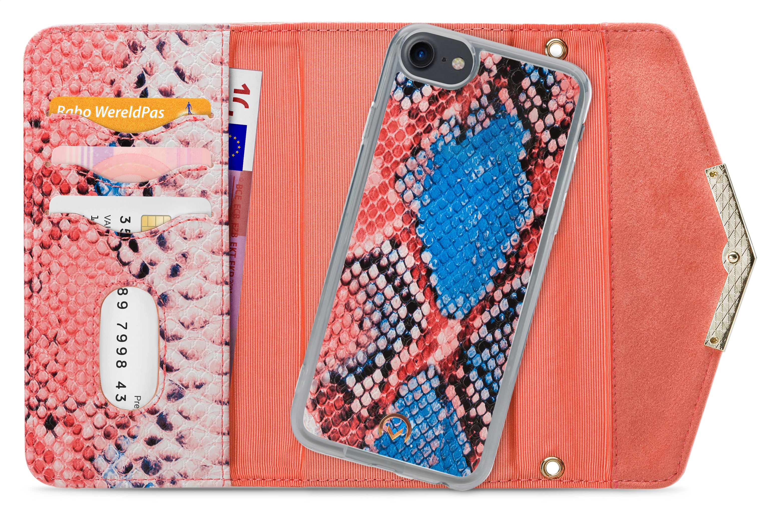 Het gebruik van de verschillende materialen en de hoge mate van afwerking maken de Clutch een unieke case. De buitenkant van de wallet is een combinatie van materiaal met een gedetailleerde slangenleren look en van materiaal met een zachte, luxe fluwele feel. Dit zet zich voort aan de binnenkant, de achterkant van de cover en de handige pols-strap, zodat alles goed bij elkaar past.
