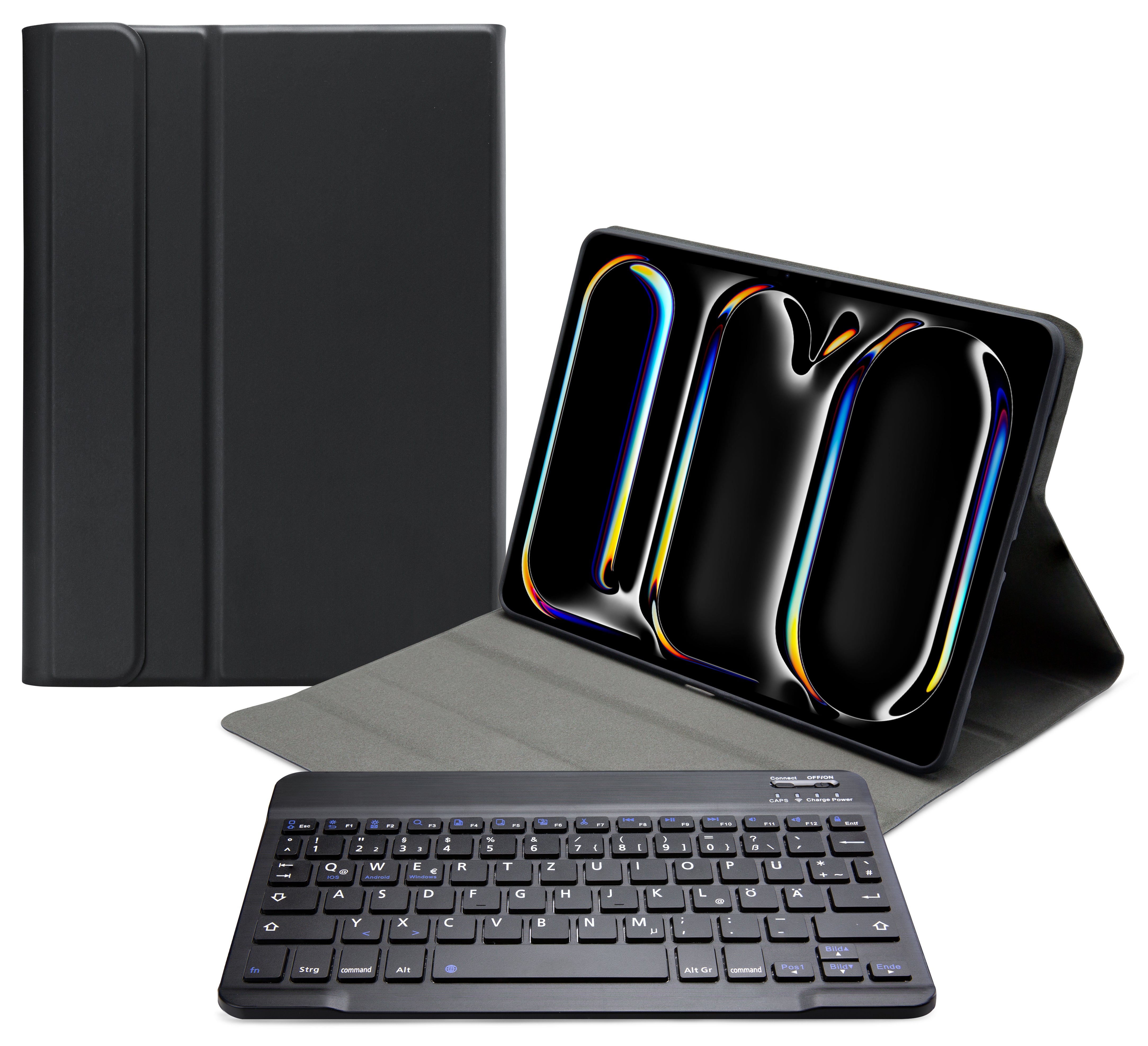 Dankzij gleuven aan de binnenkant van de case is de tablet is in 3 verschillende standen te zetten voor beter zicht op het scherm tijdens het typen van je document of Teams-vergadering. Door middel van Bluetooth maakt u verbinding met het QWERTZ-toetsenbord. Het uitneembare toetsenbord is licht van gewicht, heeft een solide bouw zodat het comfortabel typt en zit met sterke magneten stevig vast in de case. Een extra laag microfiber onder het toetsenbord zorgt er ook nog eens voor dat het niet weg zal glijden tijdens gebruik en voor extra stevigheid. In de flap van de case zit ook een sterke magneet die de gehele case netjes afsluit.