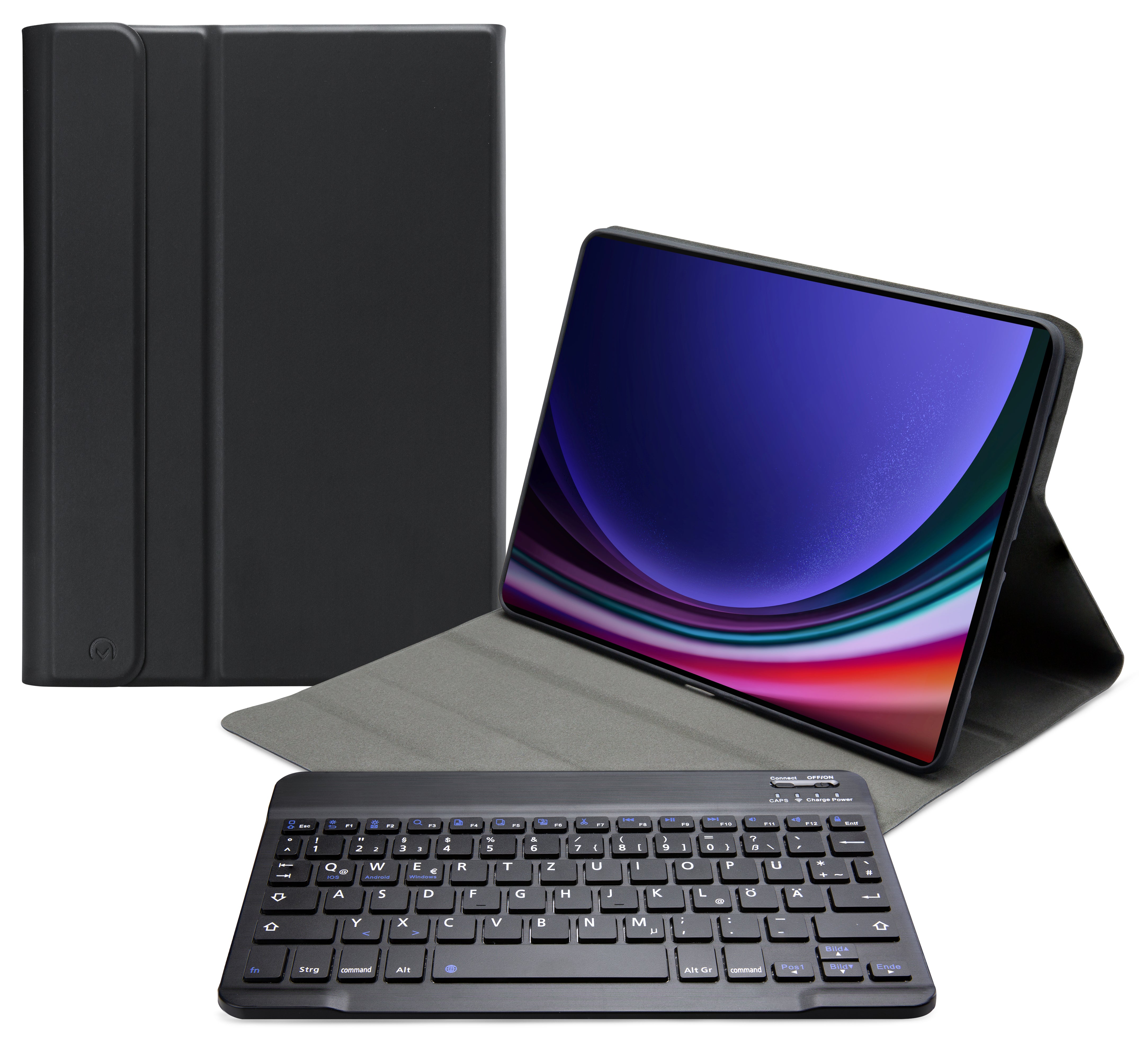 Dankzij gleuven aan de binnenkant van de case is de tablet is in 3 verschillende standen te zetten voor beter zicht op het scherm tijdens het typen van je document of Teams-vergadering. Door middel van Bluetooth maakt u verbinding met het QWERTZ-toetsenbord. Het uitneembare toetsenbord is licht van gewicht, heeft een solide bouw zodat het comfortabel typt en zit met sterke magneten stevig vast in de case. Een extra laag microfiber onder het toetsenbord zorgt er ook nog eens voor dat het niet weg zal glijden tijdens gebruik en voor extra stevigheid. In de flap van de case zit ook een sterke magneet die de gehele case netjes afsluit.