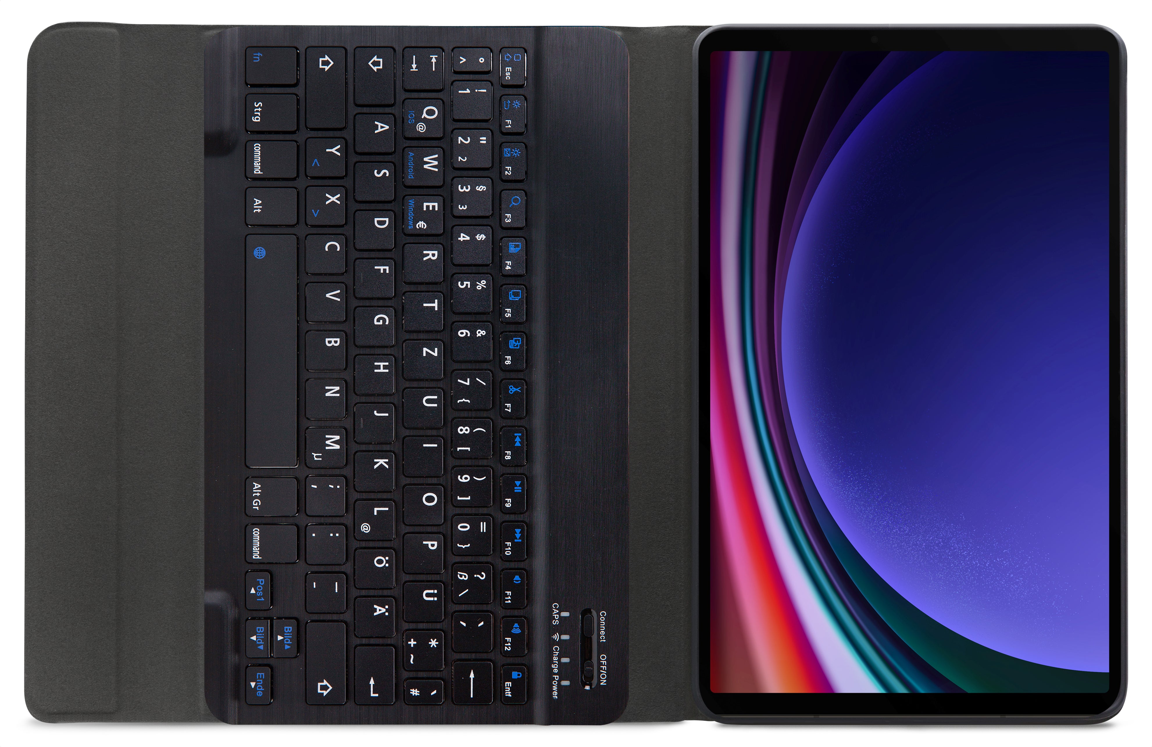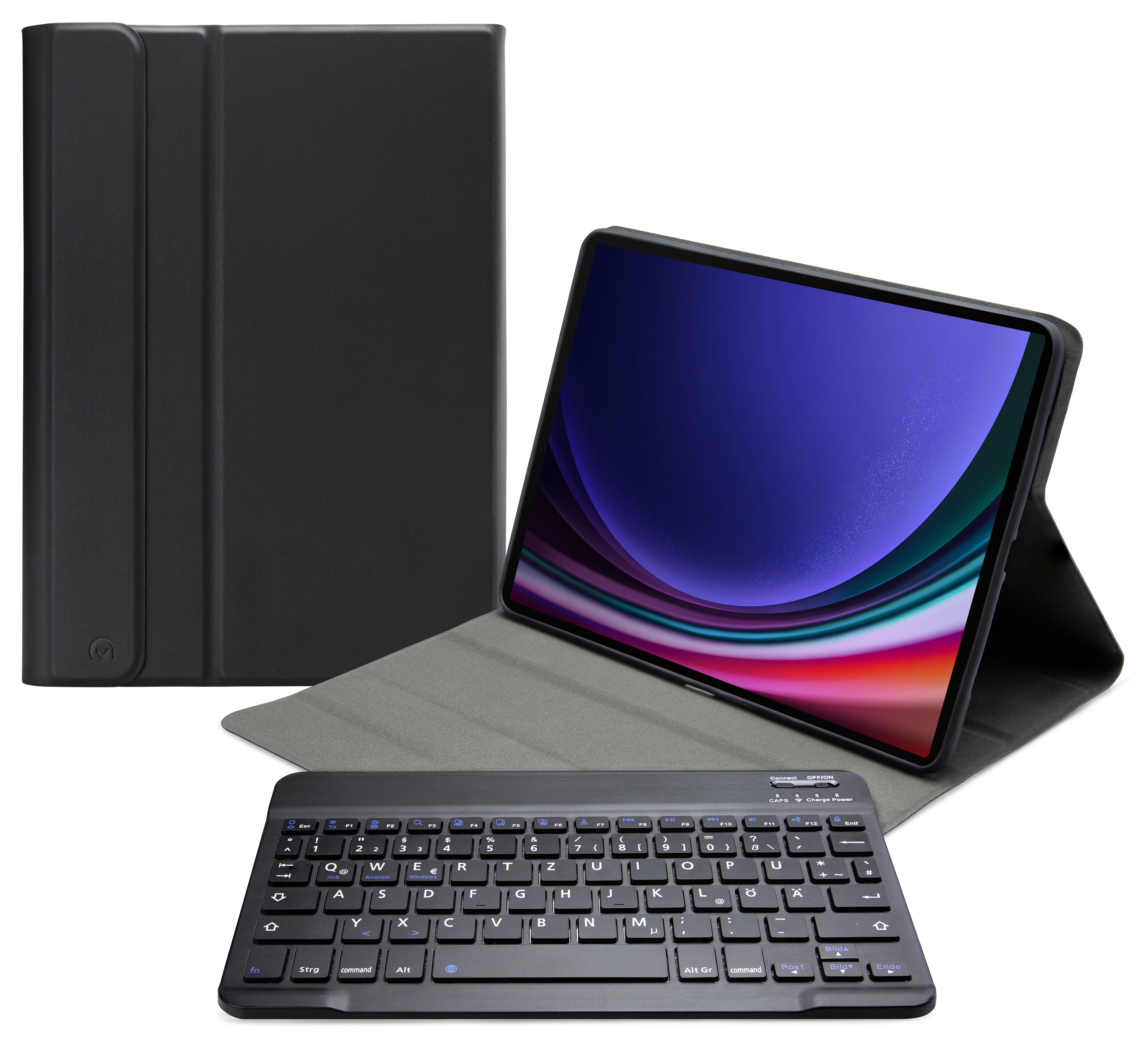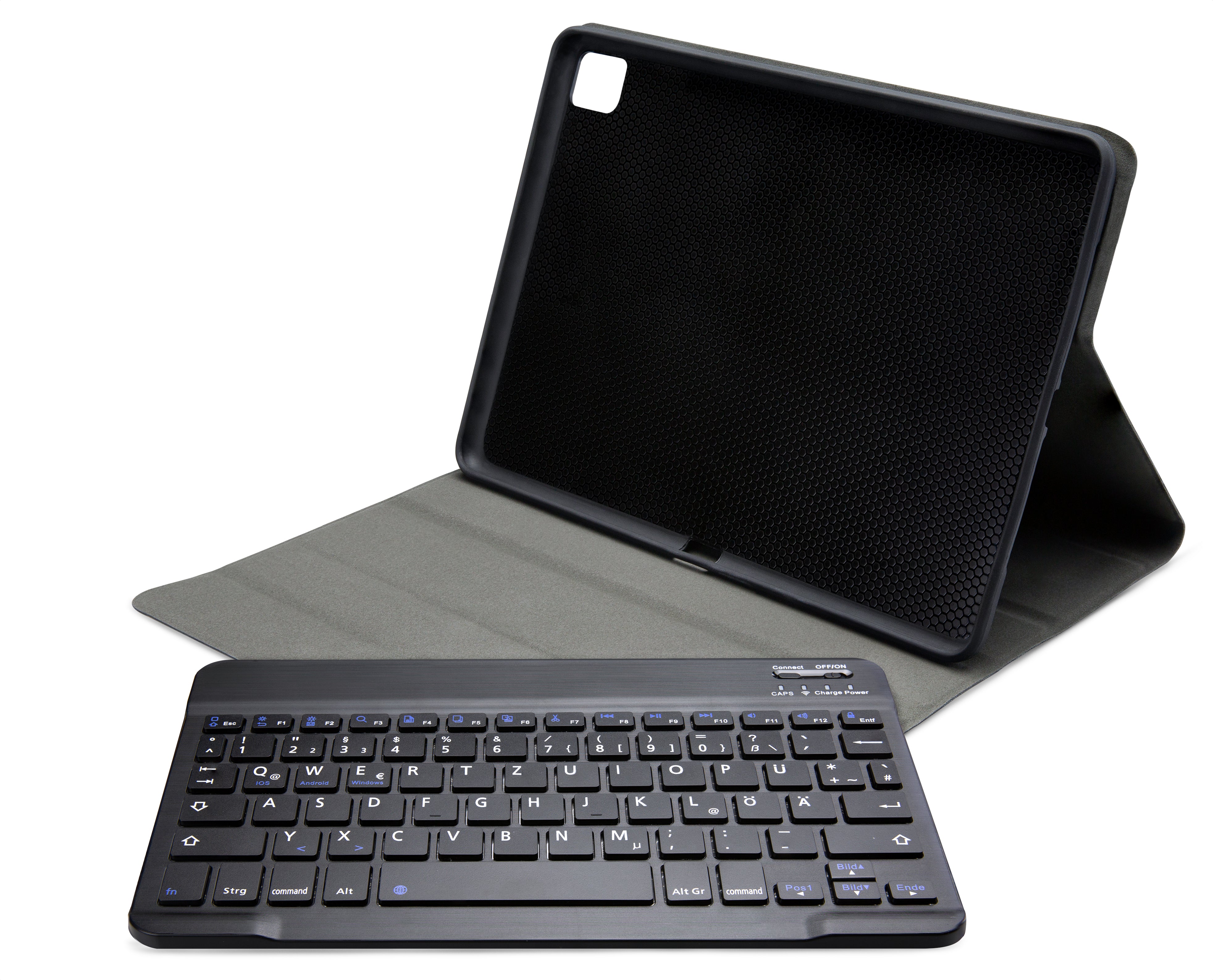 Dankzij gleuven aan de binnenkant van de case is de tablet is in 3 verschillende standen te zetten voor beter zicht op het scherm tijdens het typen van je document of Teams-vergadering. Door middel van Bluetooth maakt u verbinding met het QWERTZ-toetsenbord. Het uitneembare toetsenbord is licht van gewicht, heeft een solide bouw zodat het comfortabel typt en zit met sterke magneten stevig vast in de case. Een extra laag microfiber onder het toetsenbord zorgt er ook nog eens voor dat het niet weg zal glijden tijdens gebruik en voor extra stevigheid. In de flap van de case zit ook een sterke magneet die de gehele case netjes afsluit.