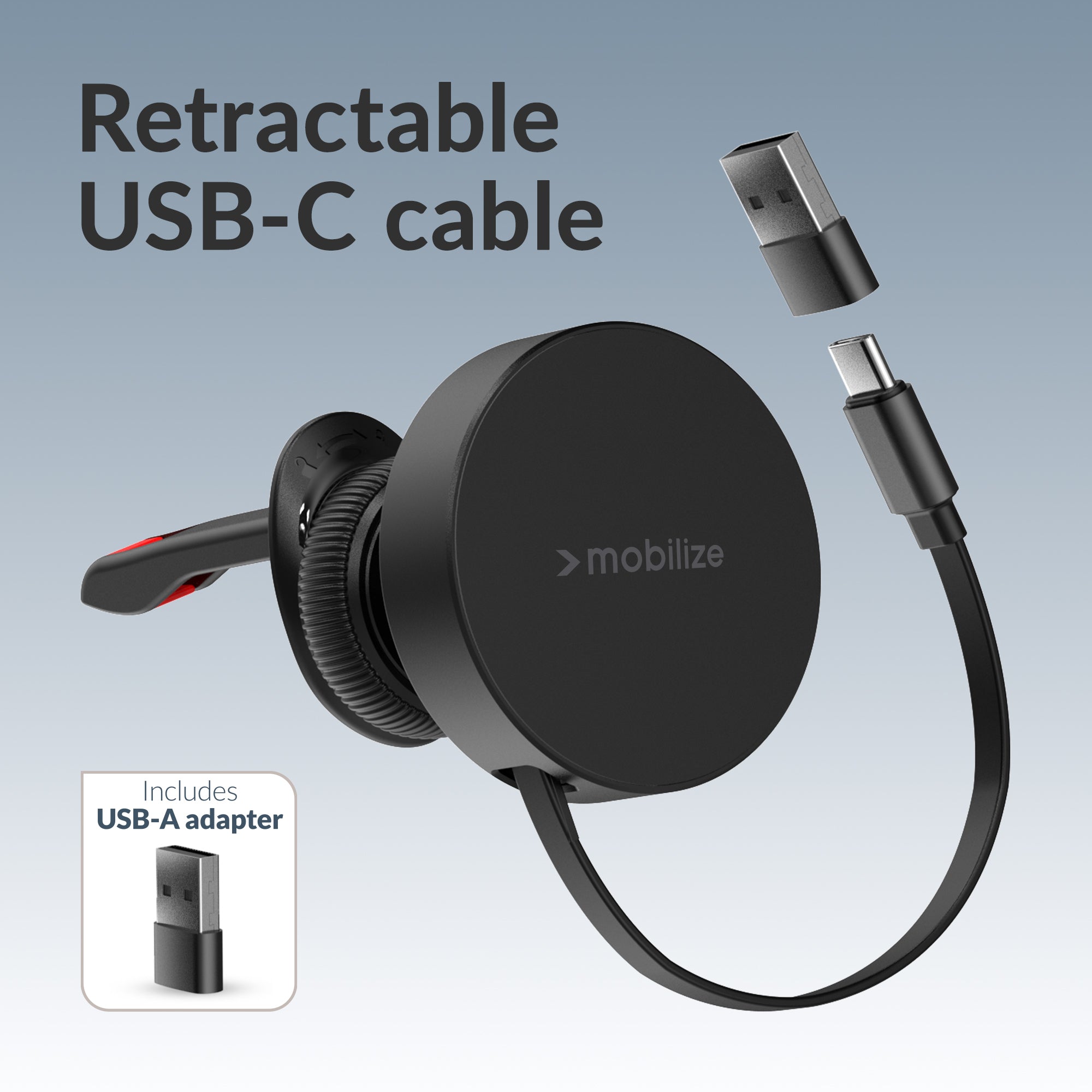 De houder wordt geleverd met een uittrekbare USB-C kabel van 100 cm, die eenvoudig opgerold kan worden wanneer deze niet in gebruik is. Daarnaast wordt er een USB-C naar USB-A adapter meegeleverd, zodat je de houder kunt aansluiten op een autolader met zowel een USB-A als USB-C connector.