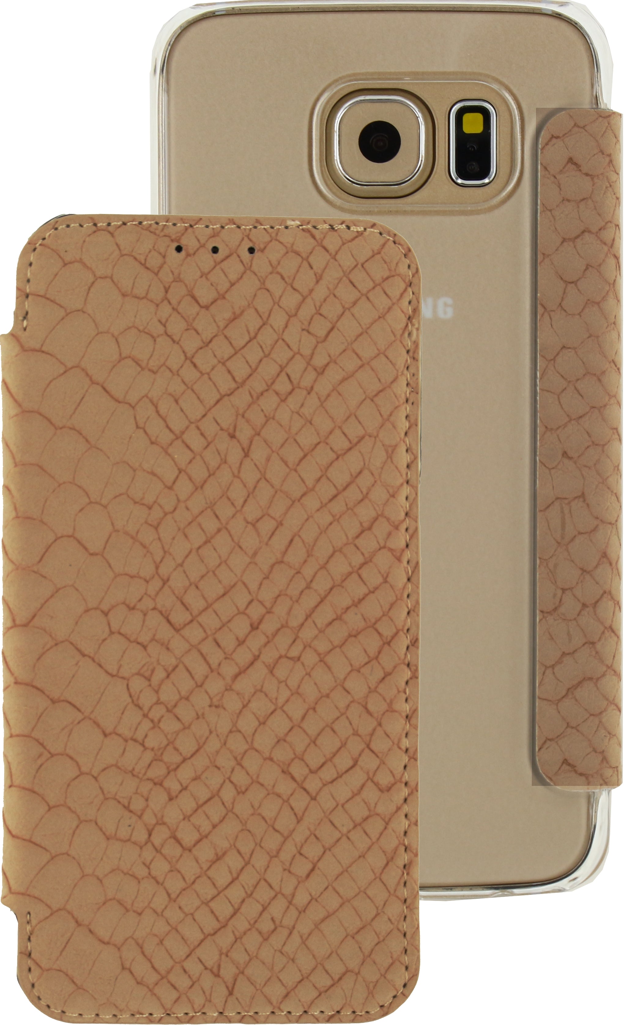 Met de Slim Booklet serie heeft u wel een heel bijzondere case in handen. Dit product is namelijk een combinatie van een hardcover en een book case. De flap aan de voorkant is gemaakt van kunstleer en voorzien van een slangenleerprint. Het materiaal voelt prettig aan en is zacht als suède. Er is een uitsparing gemaakt voor de speaker. Aan de binnenkant zit microvezel, wat bijdraagt om uw beeldscherm vlek- en krasvrij te houden. Er is hier ruimte voor een pasje, visitekaartje of briefgeld. De flap is vastgemaakt aan een semi-transparante hardcover. Zo zijn ook de achterkant en hoeken van uw telefoon beschermd tegen schade, maar dan op een minimalistische manier. Het originele design van telefoon blijft nog goed zichtbaar. Hierdoor is de case veel subtieler dan een gewone book case, maar biedt het wel dezelfde voordelen.